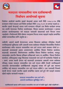नेपालको जुनसुकै स्थानबाट मतदाता नामावलीमा नाम दर्ता गराउन सकिने तर उक्त नामावली निजको स्थायी ठेगाना भएको स्थानिय तहको सम्बन्धित वडामा नै दर्ता हुने गरी पठाईने निर्वाचन आयोगको सूचनामा उल्लेख छ ।